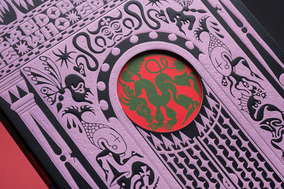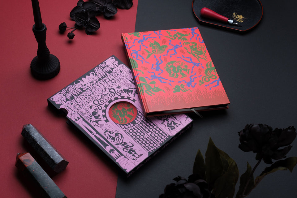The standard edition is an oversized 9" x 12" hardcover, cloth-bound in sewn signatures and housed in an elaborately embossed and debossed die-cut slipcase, silk-screened and foil-stamped with artwork.