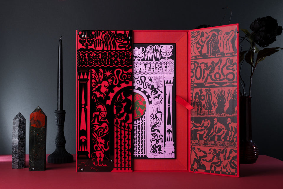 The numbered edition is a cloth-wrapped slipcase volume, featuring a foil-blocked fine art print that is exclusive to the INFERNO special editions, as well as a 1.25" die-struck enamel pin. It is signed and numbered by illustrator Sophy Hollington in an edition of 250.